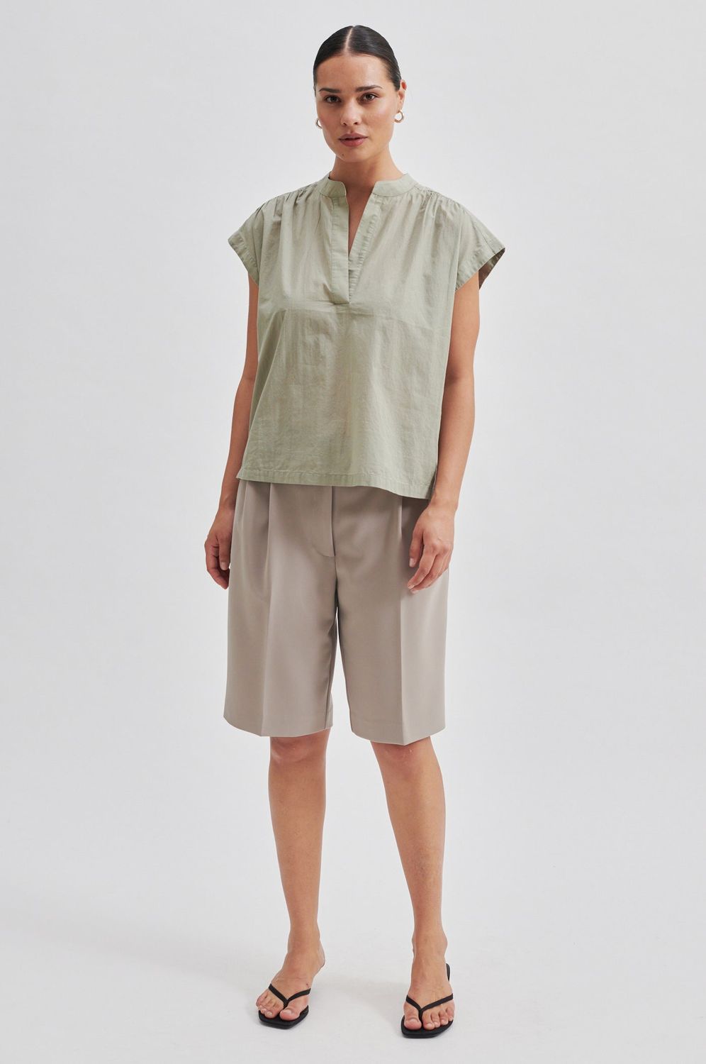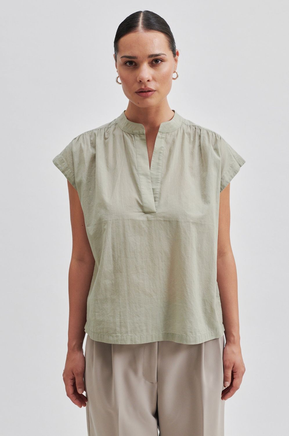 Ärmelloses Oberteil hergestellt aus weicher und glatter Bio-Baumwolle. Mit Mandarinkragen und offenem Halsausschnitt. Keine Ärmelnaht an der Schulter, mit kleinen Raffungen entlang der oberen Schulterpasse. Gerader Saum. Lockere, entspannte Passform.
