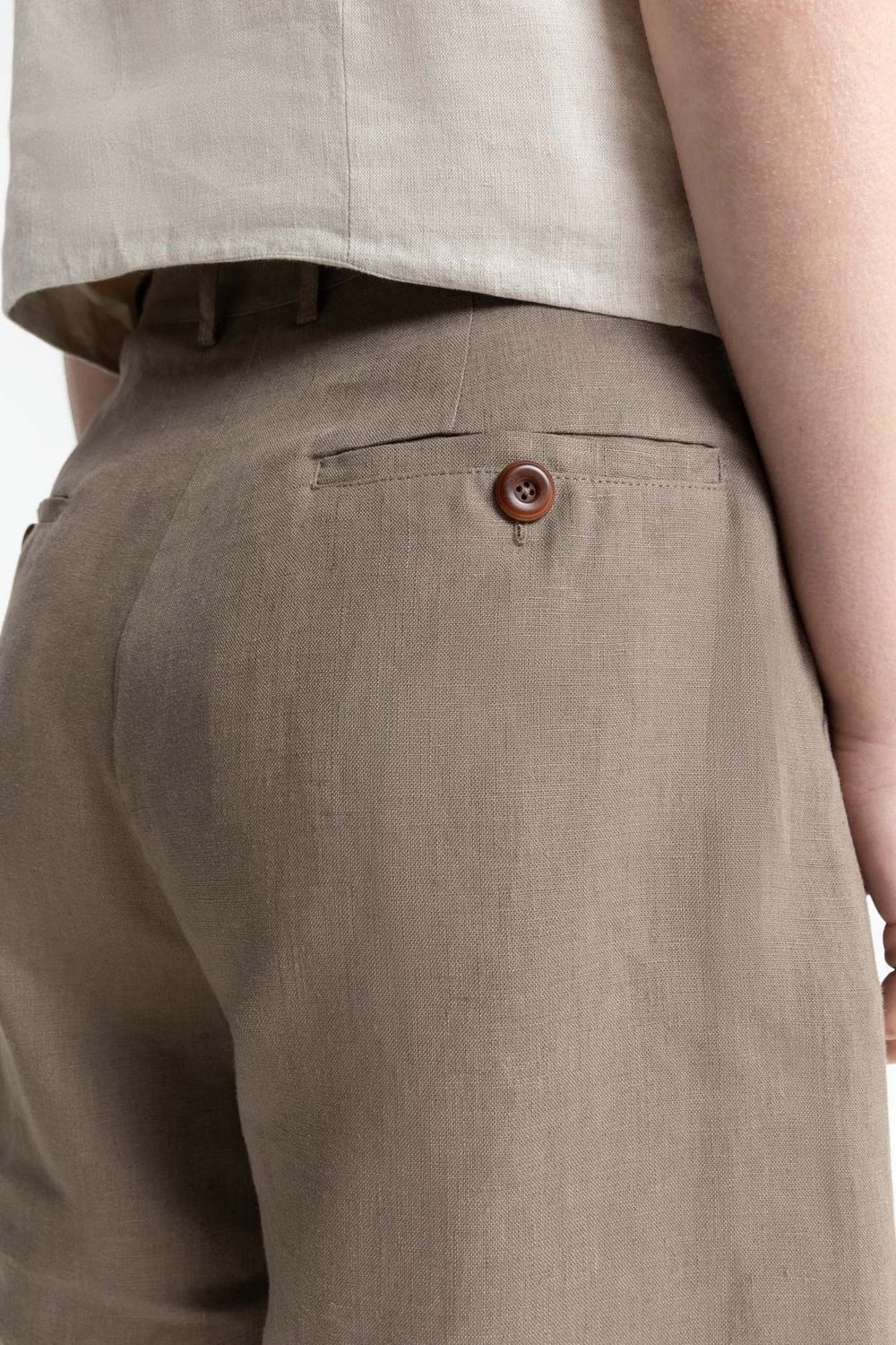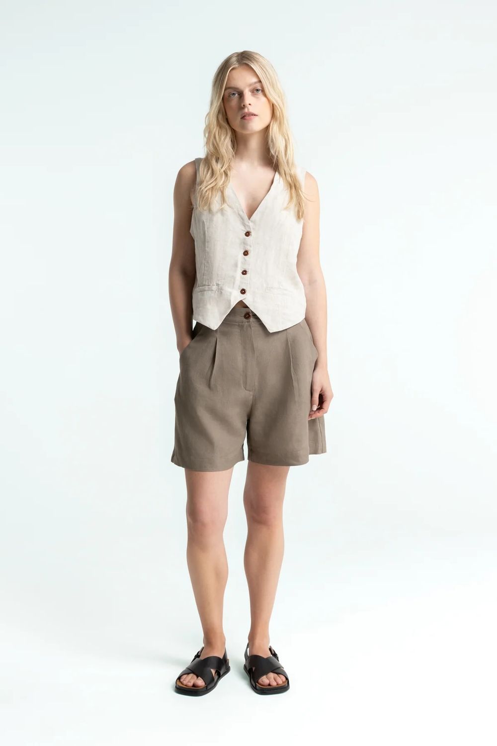Die MAKEDA-Shorts aus 100 % Leinen haben eine taillierte Passform und sind unten weit geschnitten. Sie bieten eine sehr bequeme Passform mit Taschen vorne und hinten sowie Falten für einen schönen Fall.