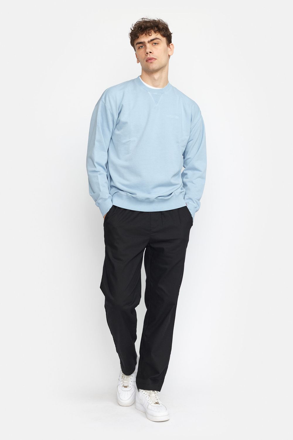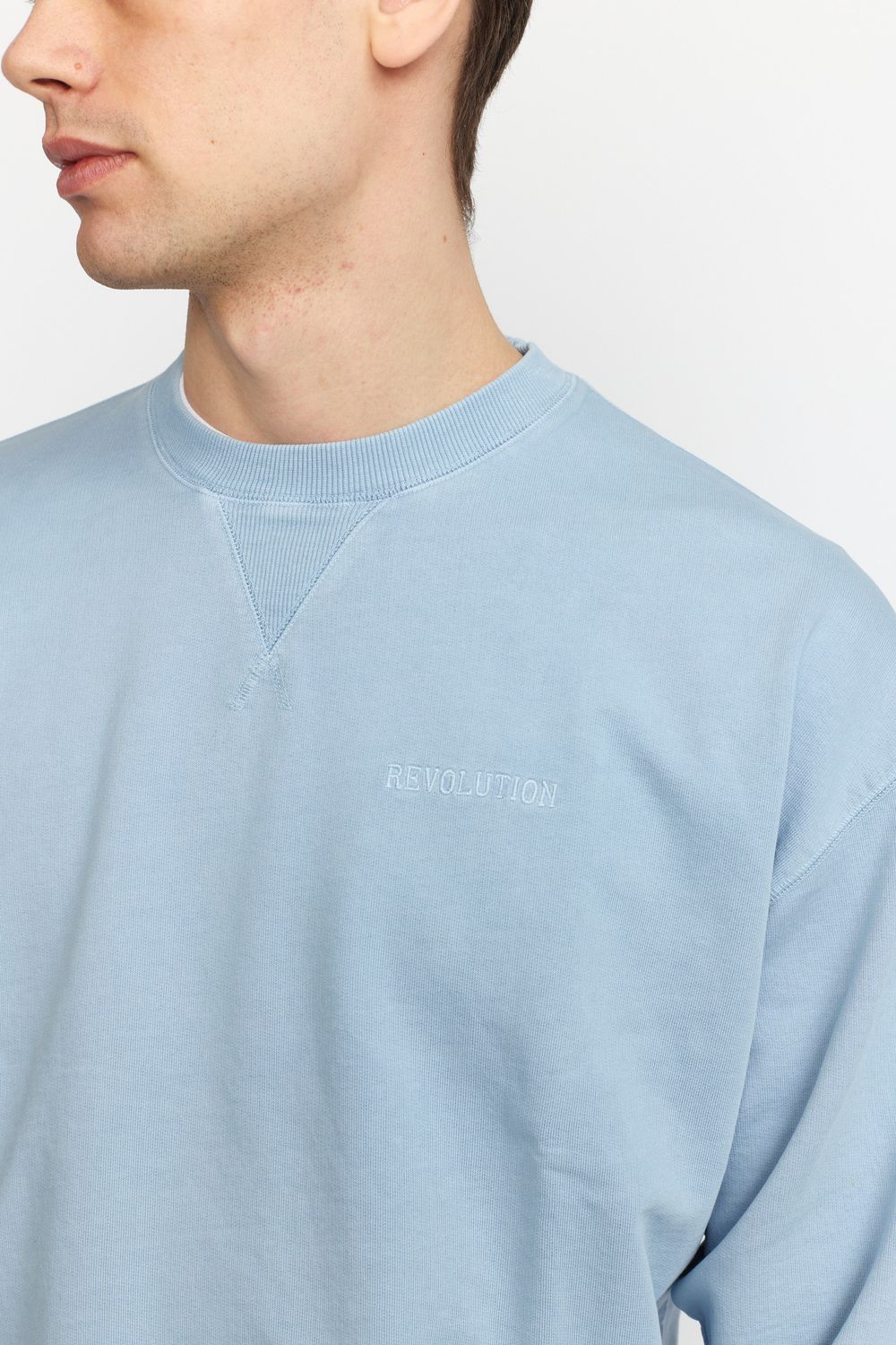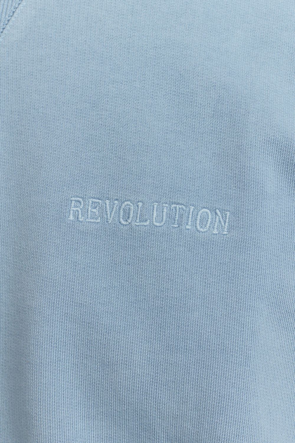 Locker geschnittenes Sweatshirt mit Rundhalsausschnitt aus durchgefärbter Bio-Baumwolle mit einem Gewicht von 350 GSM. Das Sweatshirt ist mit einer charakteristischen V-Kerbe am Kragen versehen, die an ein traditionelles Fußballtrikot aus dem Jahr 1926 erinnert, um die Stabilität am Hals zu gewährleisten. Der Färbeprozess, den dieses Sweatshirt durchlaufen hat, verleiht dem Stoff einen coolen Vintage-Look, der mit der Zeit immer mehr an Charakter gewinnt. Die Veredelung des Sweatshirts macht es weich und sorgt für Stabilität und Haltbarkeit des Sweatshirts. Das Sweatshirt mit Rundhalsausschnitt hat eine kleine „Revolution“-Stickerei auf der Brust und ein Markenlabel am unteren Rand, und alle Nähte sind für einen lässigen Look flach verschweißt.