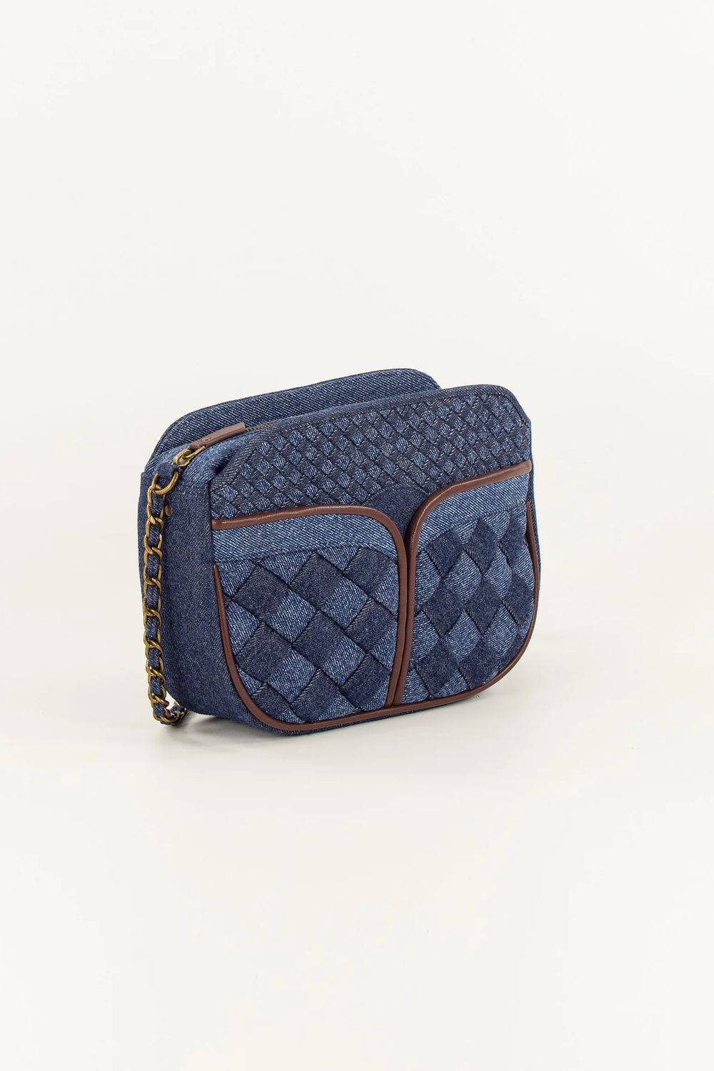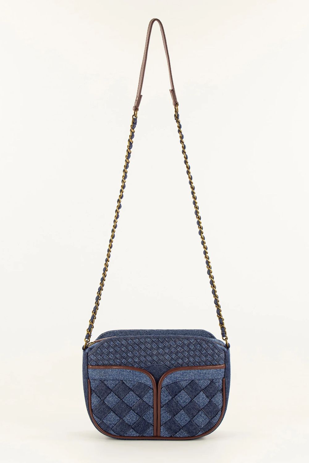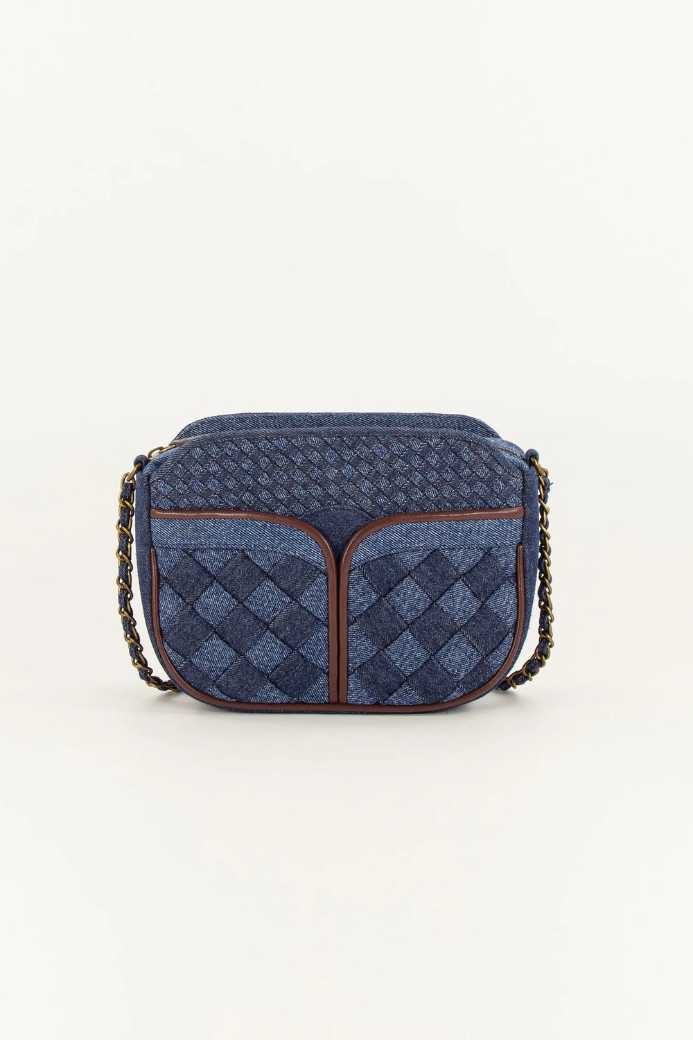 Geflochtene und abgesteppte Handtasche aus zweifarbigem Baumwoll-Denim.