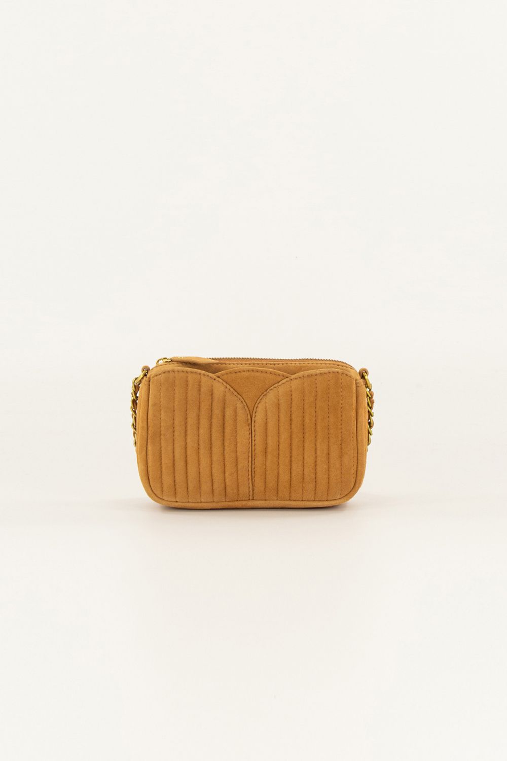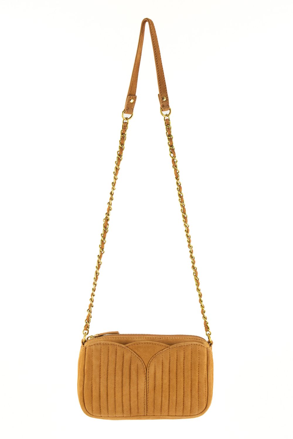 Kleine Handtasche aus gestepptem, metallisiertem aufgerautes Ziegenleder mit Tragekette.