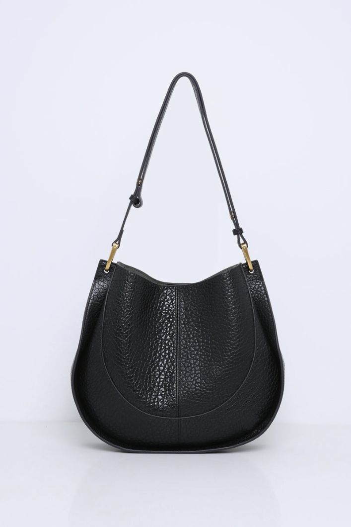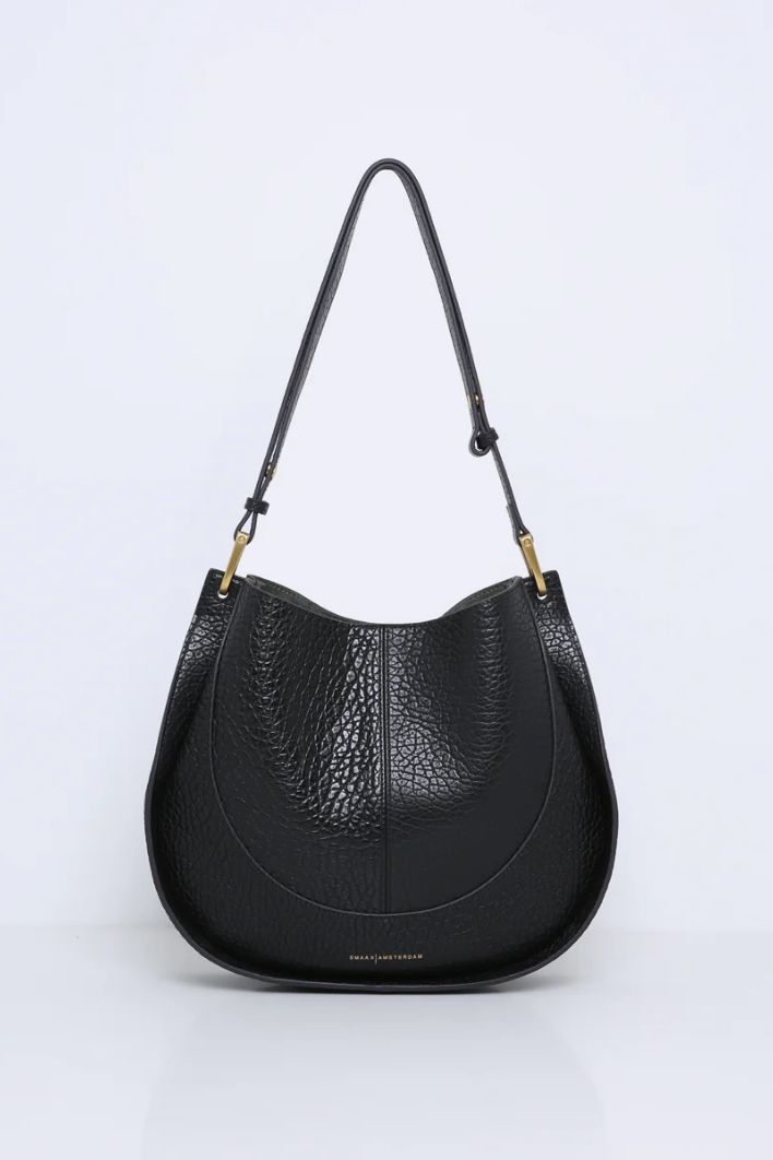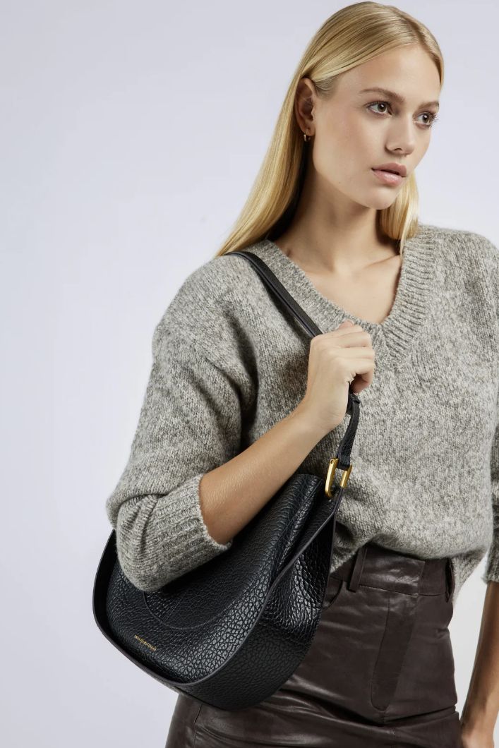 Die Umhängetasche RAVEL hat eine halbrunde Form, die sie wie einen Halbkreis oder Bogen aussehen lässt. Das Finish hat schöne Linien im Design, die die fließende Bogenform betonen. Dies verleiht der Tasche ein einzigartiges und elegantes Aussehen.