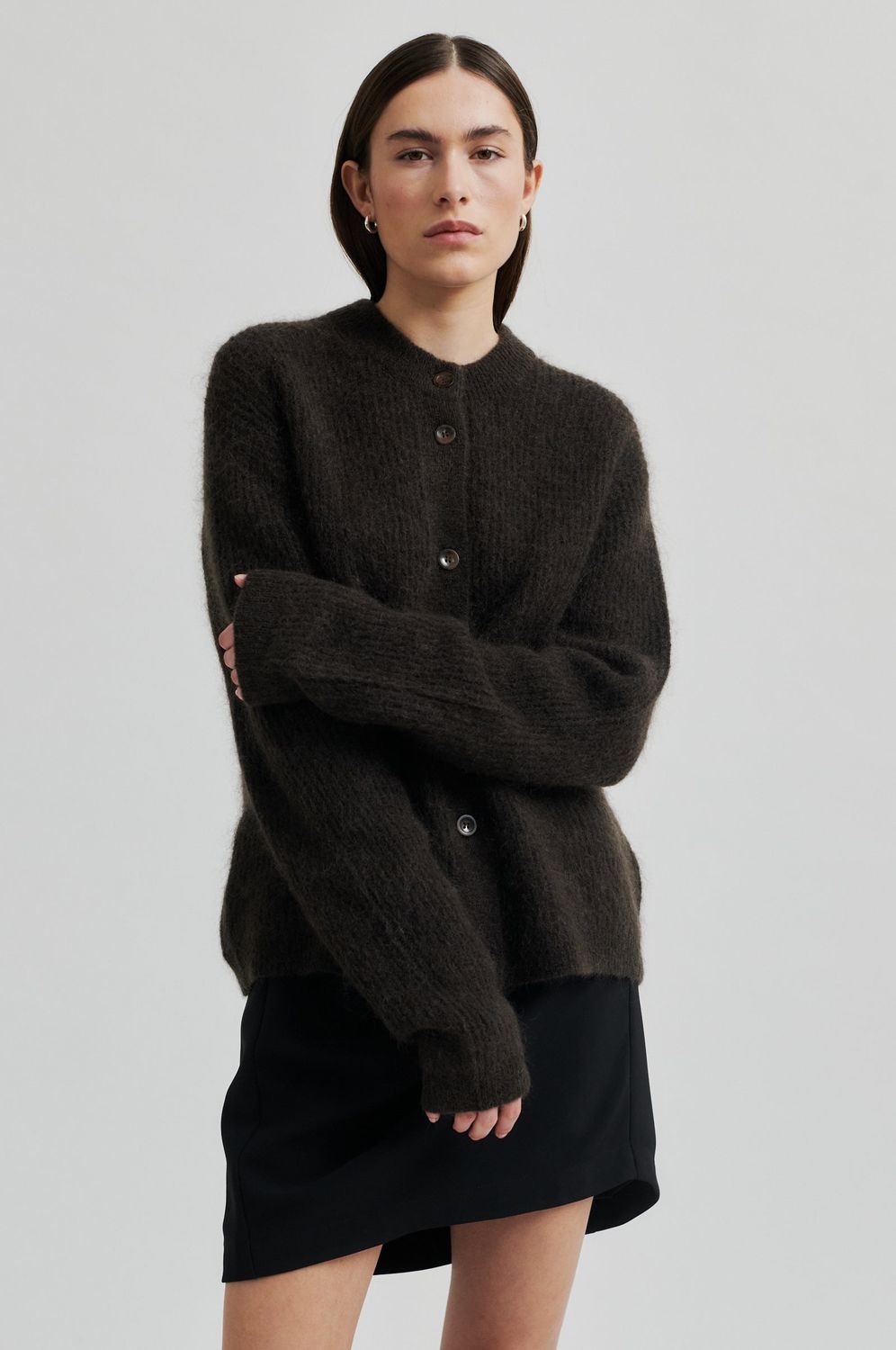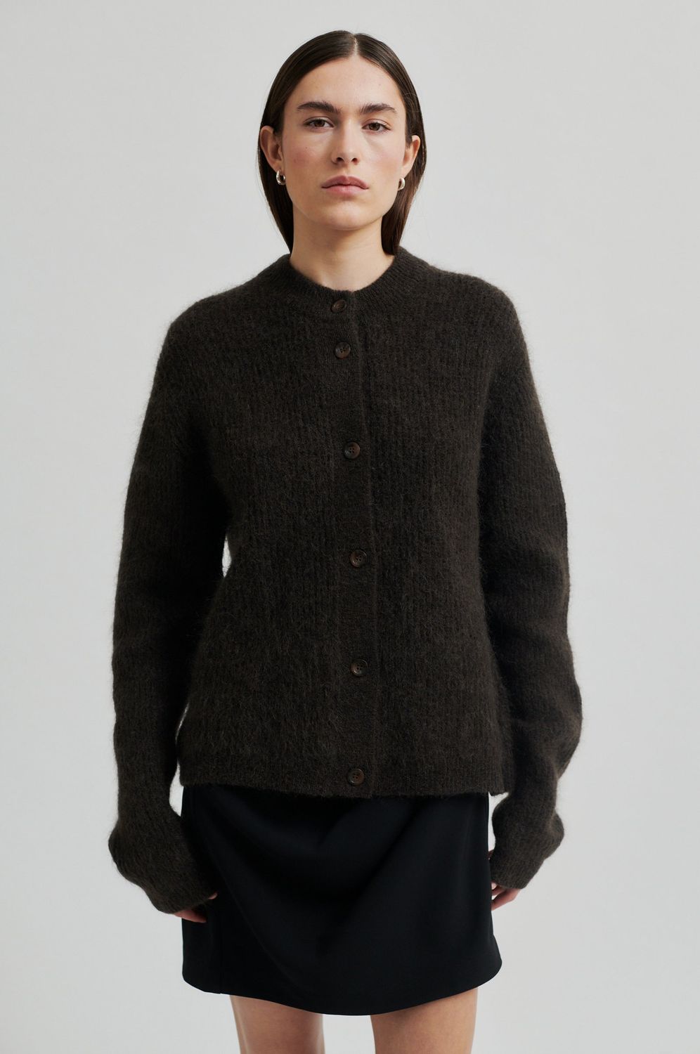 Gerippte Strickjacke von Second Female. Die Strickjacke ist aus einer weichen und dehnbaren gerippten Mohair-Woll-Mischung mit leicht flauschiger Textur gefertigt. Mit Rundhalsausschnitt und durchgehender Knopfleiste. Überschnittene Schultern und lange Ärmel. Gerippter Halsausschnitt, Knopfleiste, Bündchen und Saum. Normale Passform, die entspannt und angenehm zu tragen ist.