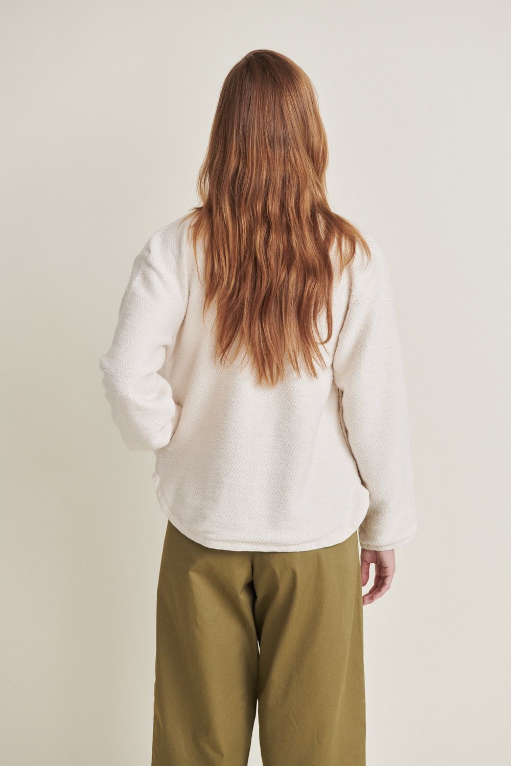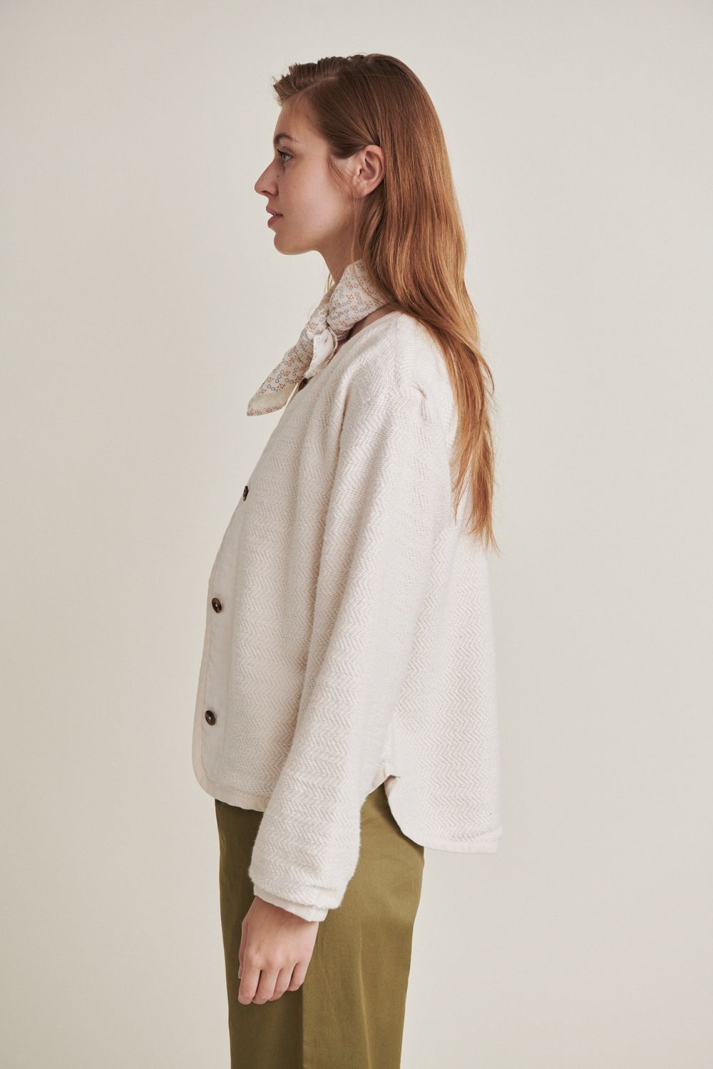 Turid Cardigan besteht aus einem Stoff mit einer interessanten Wellenstruktur auf der Oberfläche. Der Stoff besteht zu 100% aus Bio-Baumwolle und ist GOTS-zertifiziert.